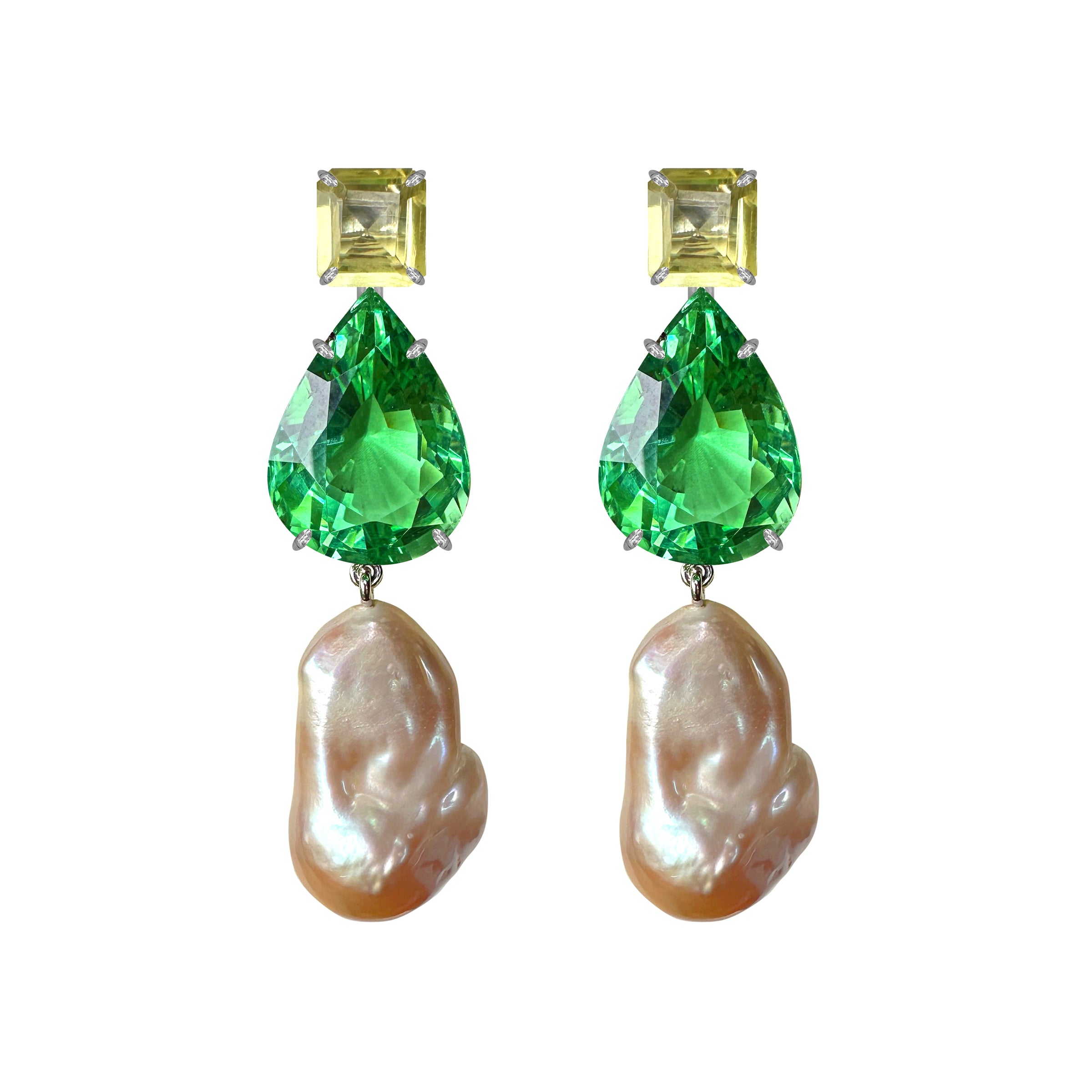 Earrings - Lemon Quartz, Green Quartz & Baroque Pearl Trio