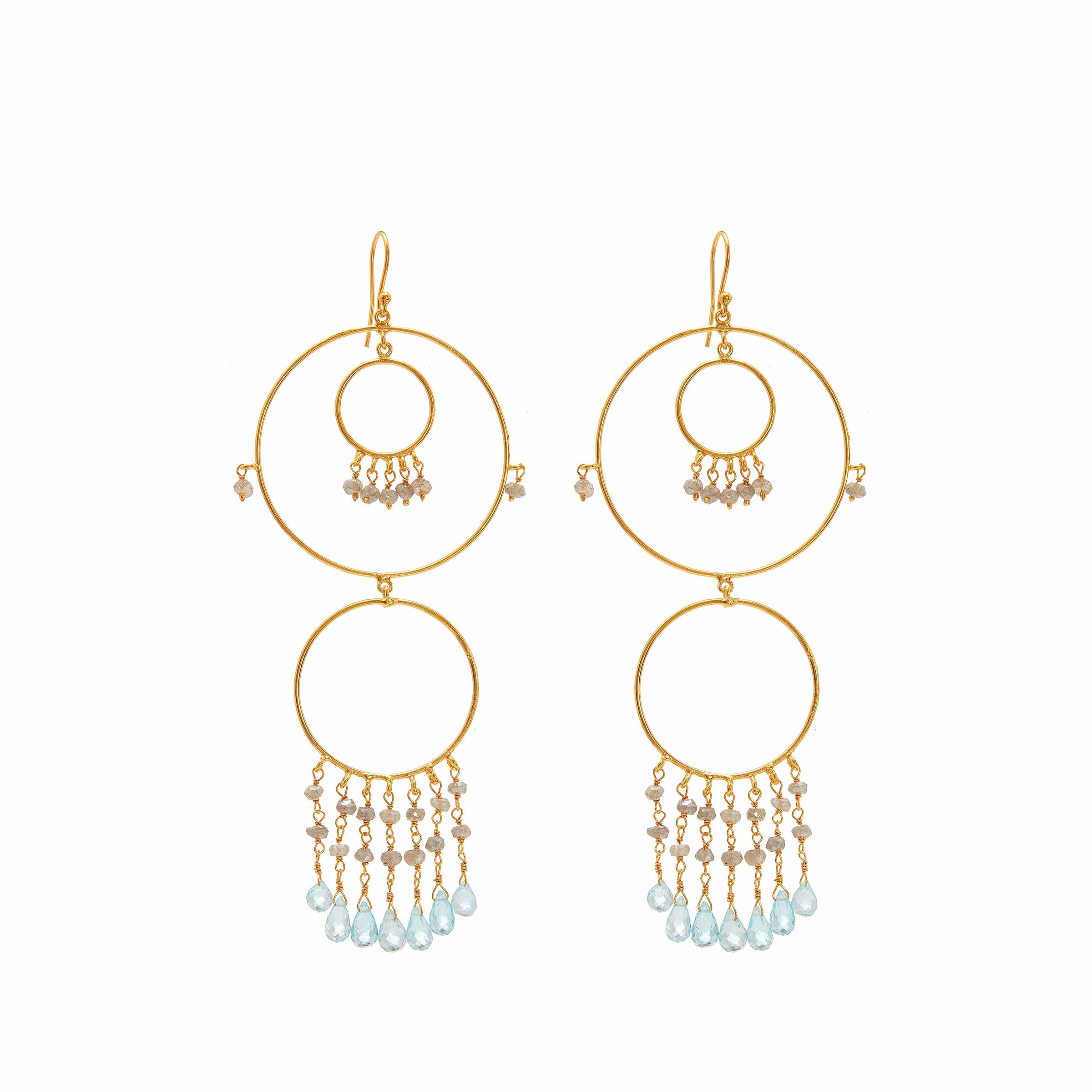 - Delicate layered circles dancing with Blue Topaz briolette and Labradorite rondelles.