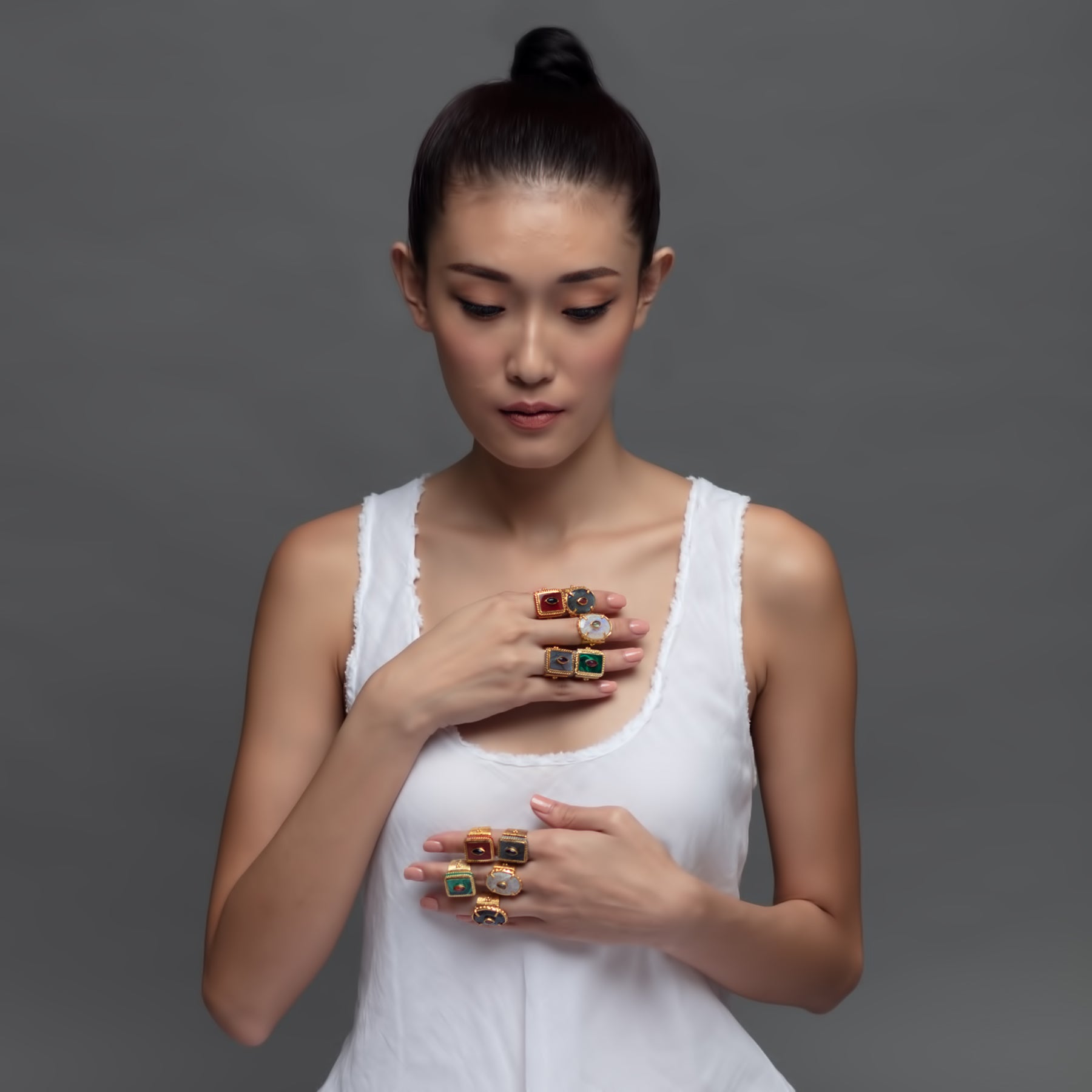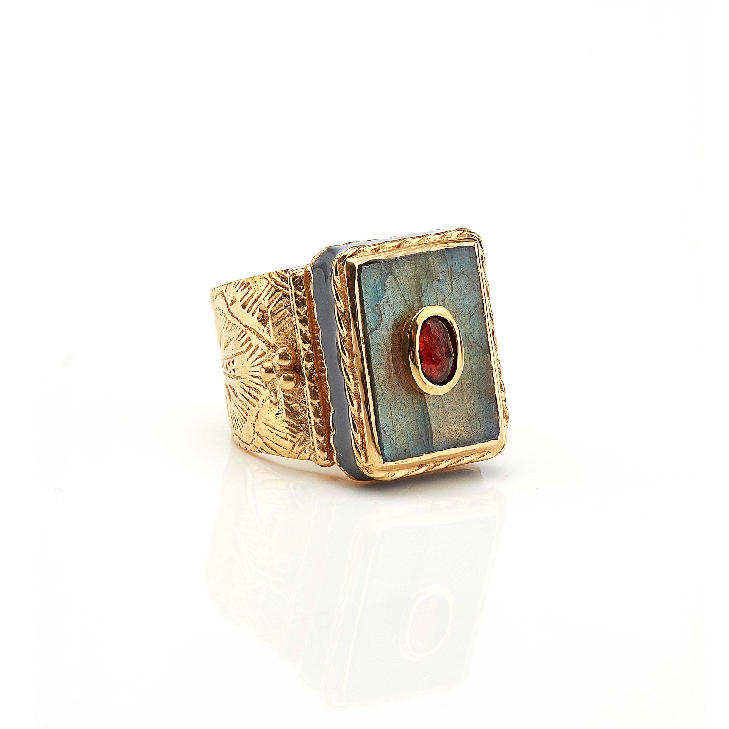 This superb 24 carat gold plated brass ring is set with a gorgeous rectangle cut inset with another semi-precious stone. Its design makes it a unique spectacular pieces to wear alone